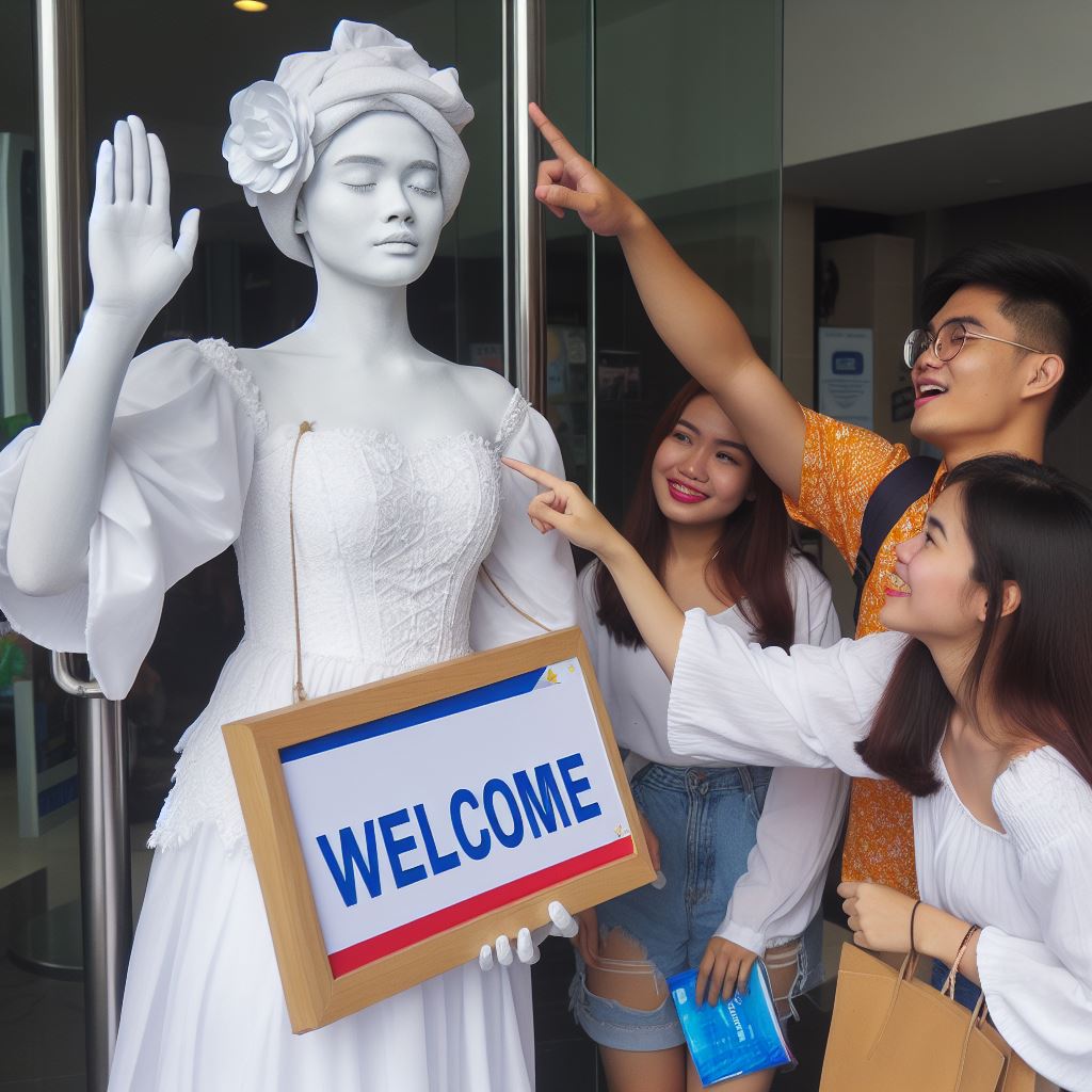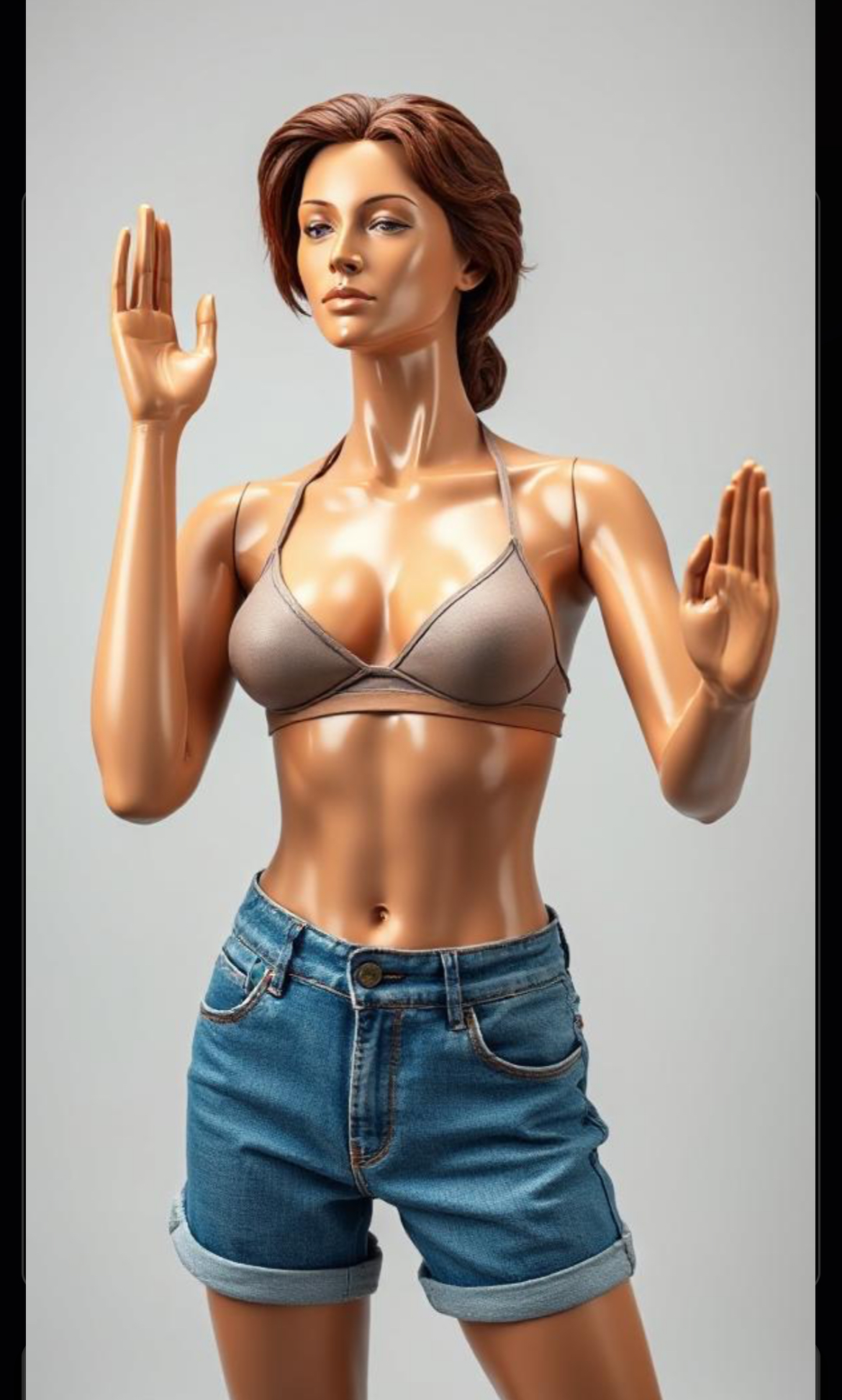 “Woman mannequin with shiny flesh toned skin, brown hair, and wearing jean shorts and a swimsuit top”